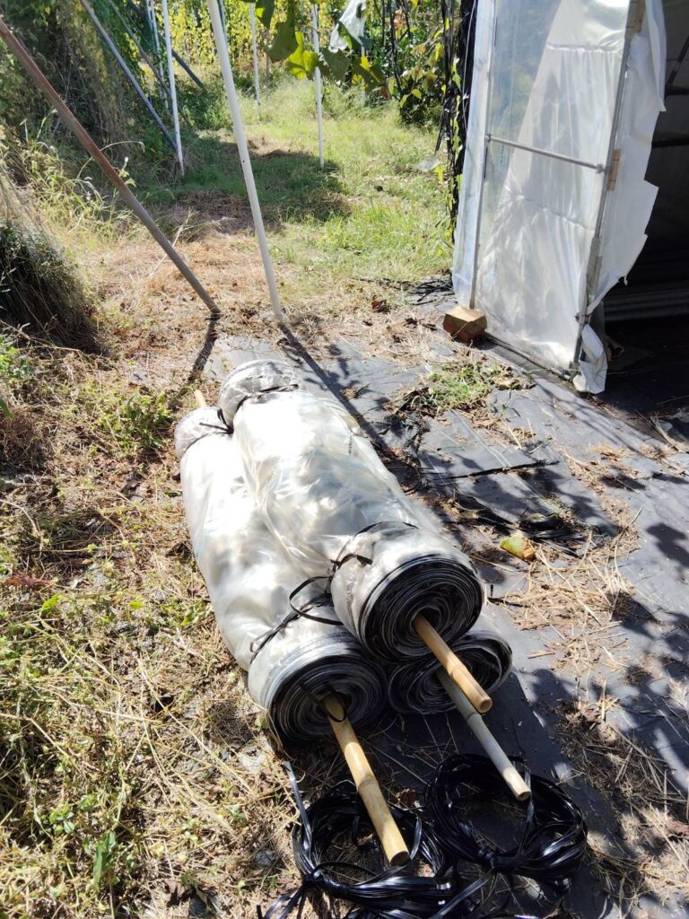 ②天井の雨除けシートを取り外し、来年度に使う分はロールにして保管します。